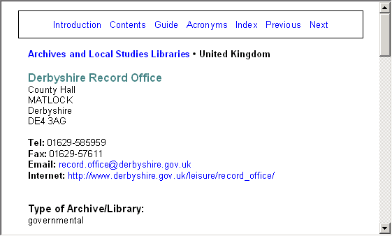 To facilitate naviation, all pages in The Libraries Directory include links to the Introduction, the Contents page, and to this Online Guide. Additionally, each entry includes links to the main Index page for the relevant category, the Index of Acronyms, and the Previous and Next entries in that category: